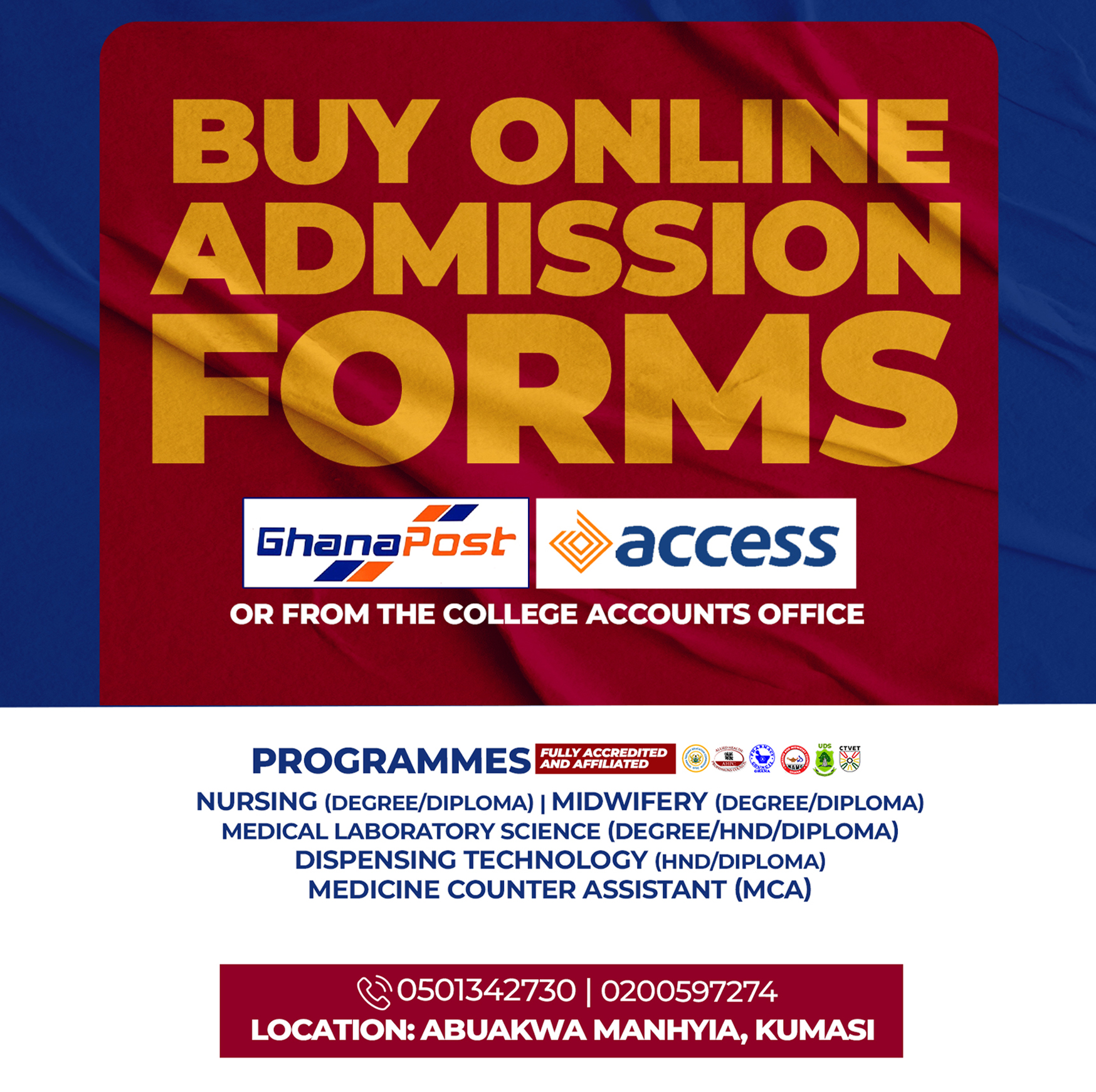 Hurray! Admission Forms for BSc. Medical Laboratory Science, BSc Nursing and BSc Midwifery are out. Take the opportunity to apply and enhanced your knowledge in healthcare profession...